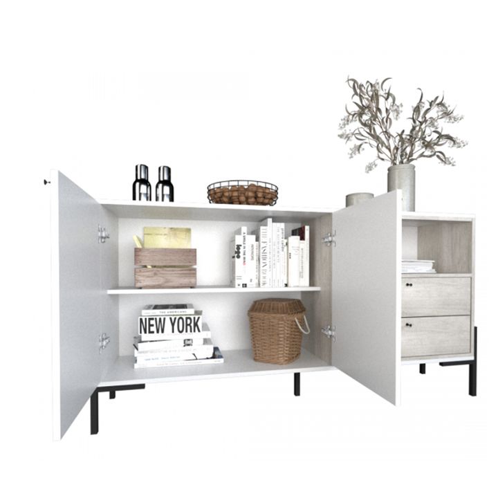 Bahiut Línea MetalWood. Melamina de alta resistencia. Dos cajones con correderas metálicas. Dos puertas con interiores revestidos. Bisagras metálicas. Tiradores metálicos. Color Everest y Nevado. Medidas: Ancho: 1.53 mts. Alto: 0.80 mts. Profundidad: 0.36 mts. Producto seleccionado para venta...