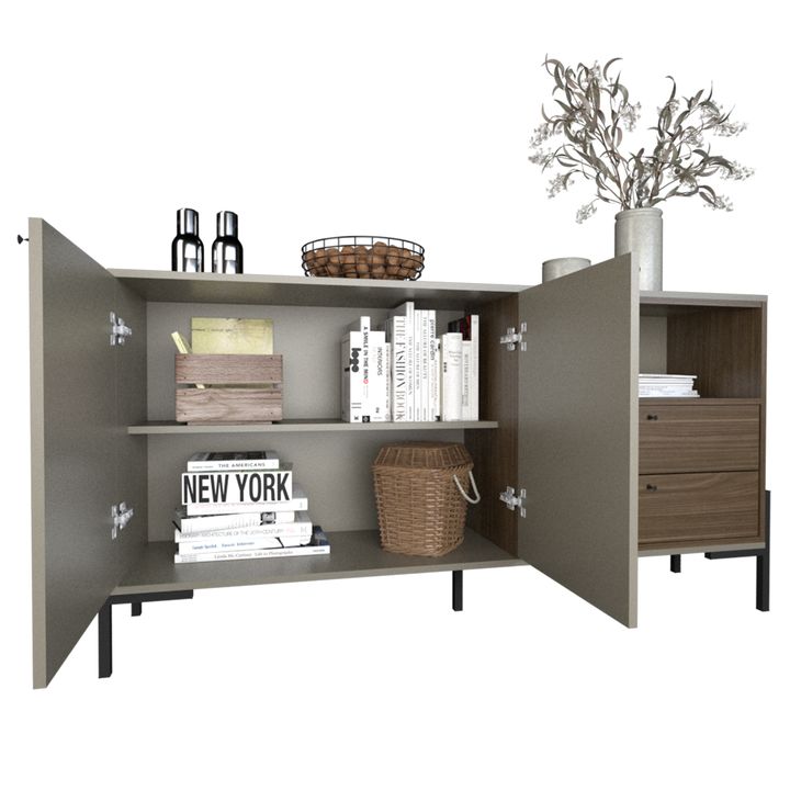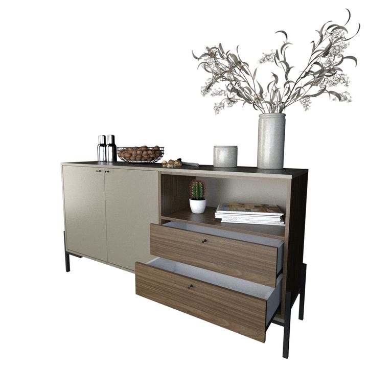 Bahiut Línea MetalWood. Melamina de alta resistencia. Dos cajones con correderas metálicas. Dos puertas con interiores revestidos. Bisagras metálicas. Tiradores metálicos. Color Gris y Nogal. Medidas: Ancho: 1.53 mts. Alto: 0.80 mts. Profundidad: 0.36 mts.