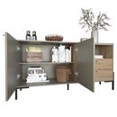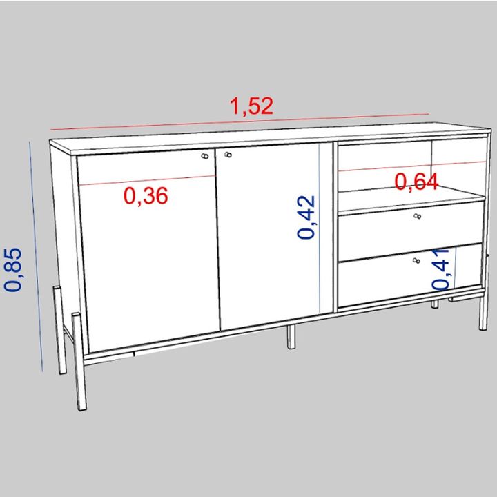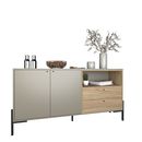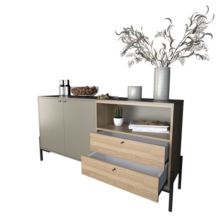 Bahiut Línea MetalWood. Melamina de alta resistencia. Dos cajones con correderas metálicas. Dos puertas con interiores revestidos. Bisagras metálicas. Tiradores metálicos. Color Gris y Olmo Finlandés. Medidas: Ancho: 1.53 mts. Alto: 0.80 mts. Profundidad: 0.36 mts.