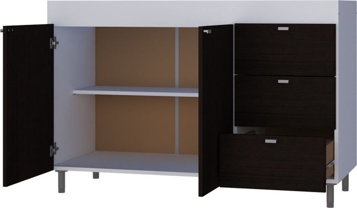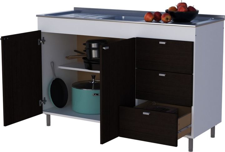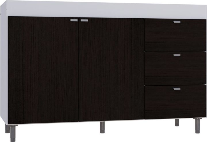 BAJO MESADA 120CM 4029 BLANCO WENGUE MUEBLES ORLANDI -3 cajones -2 puertas -Correderas plásticas -1 estante -Patas regulables en altura -Cajonera derecha/izquierda -Melamina de 15 mm -Medidas (AnxAlxProf)1200x800x470 mm -Color Blanco / Wengue -FOTO ILUSTRATIVA / NO INCLUYE TAPA MESADA DE ACERO INOXI...