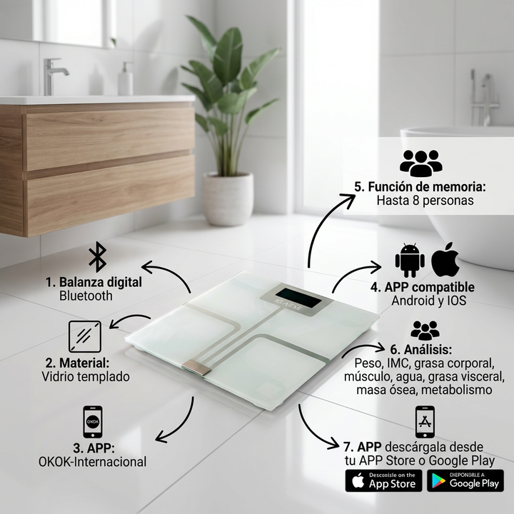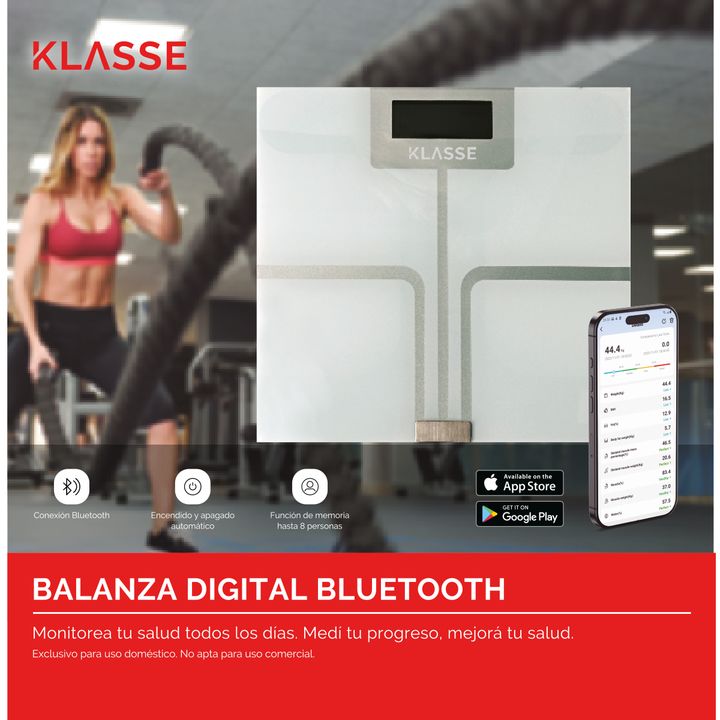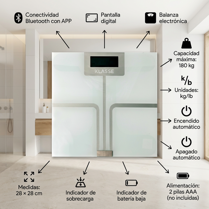 La balanza digital para personas Bluetooth Klasse permite controlar el peso corporal de forma rápida y cómoda en el hogar.