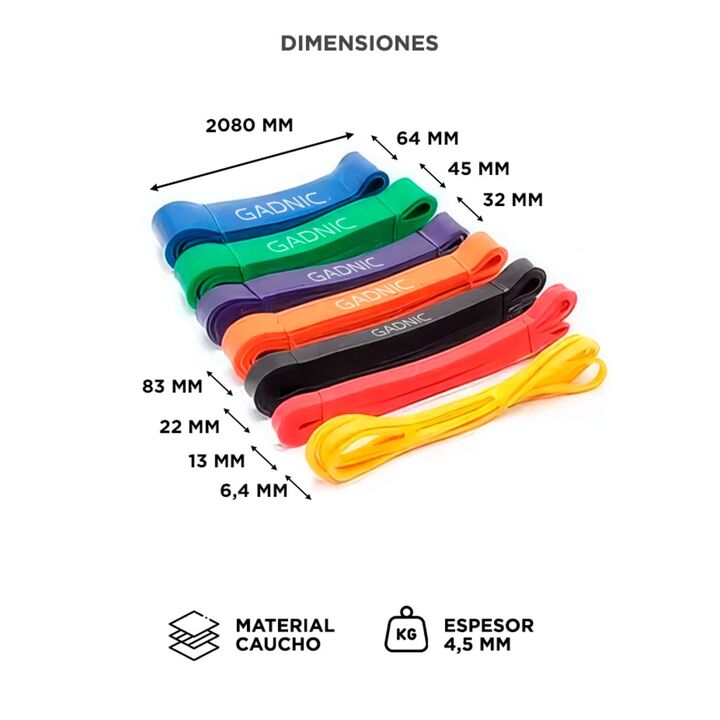 ¡Nuevo set de bandas de entrenamiento Gadnic! Estos juegos de banda de potencia están hechos de material de goma de alta calidad, cómodo y ecológico. Incluye 7 niveles para que elijas. Es súper versátil, se puede usar en tobillos, rodillas, piernas, muslos y muñecas. También es útil para bajar de pe...