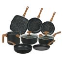 Bateria linea ETHNO , con antiadherente ceramica en su interior. Material : Aluminio con antiadherente ceramico en su interior. El mango es de baquelita simil madera , tacto soft touch siliconado . El interior tiene antiadherente ceramico ( pintitas blancas) , el exterior es liso. Compuesto por : 1-...