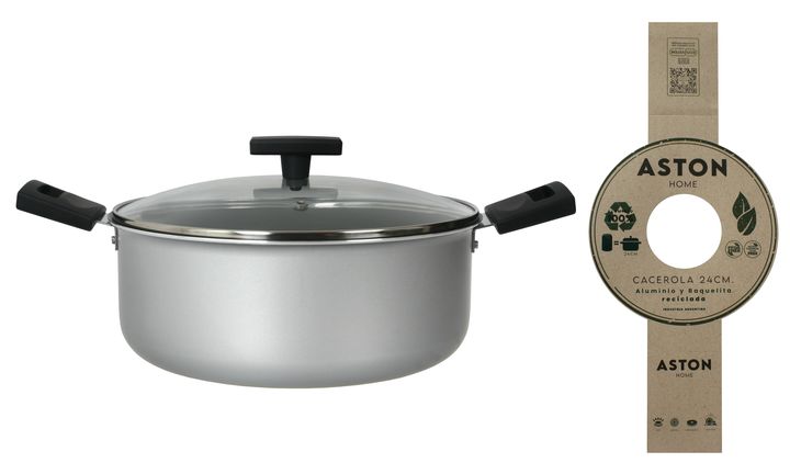 Batería de Coccion Aston Ecologica Reciclada compuesta por : Material : Aluminio Reciclado con antiadherente en su interior de 2 mm de espesor. El mango es fabricado a partir de materias primas naturales y materiales regenerados. Cacerola 24 cm con tapa de vidrio templado con orificio para salida de...