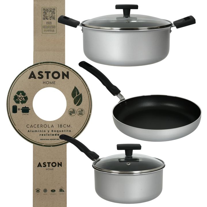 Batería de Coccion Aston Ecologica Reciclada compuesta por : Material : Aluminio Reciclado con antiadherente en su interior de 2 mm de espesor. El mango es fabricado a partir de materias primas naturales y materiales regenerados. Cacerola 24 cm con tapa de vidrio templado con orificio para salida de...
