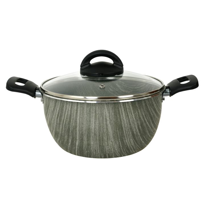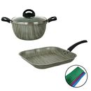 Batería Aston Terra Premium compuesta por : Material : Aluminio con antiadherente de 1,8 mm de espesor con mangos Baquelita negra Cacerola 20 cm con tapa de vidrio templado con orificio para salida de vapor, 1,8 mm de espesor. Altura de olla : 10.5 cms / Capacidad : 2,8 lts. Grill Bífera Antiadheren...