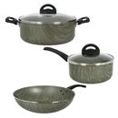 Batería Aston Terra Premium compuesta por : Material : Aluminio con antiadherente de 1,8 mm de espesor con mangos Baquelita negra Cacerola 24cm con tapa de vidrio templado con orificio para salida de vapor, 1,8 mm de espesor. Altura de olla : 9,5 cms / Capacidad : 4,5 lts. Cacerola 18cm con tapa de ...