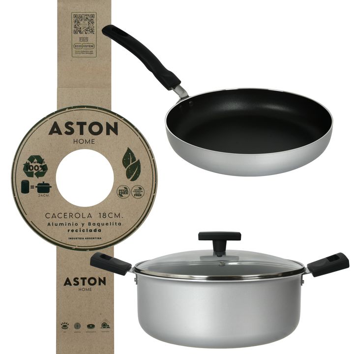 Batería de Coccion Aston Ecologica Reciclada compuesta por : Material : Aluminio Reciclado con antiadherente en su interior de 2 mm de espesor. El mango es fabricado a partir de materias primas naturales y materiales regenerados . Cacerola 24 cm con tapa de vidrio templado con orificio para salida d...
