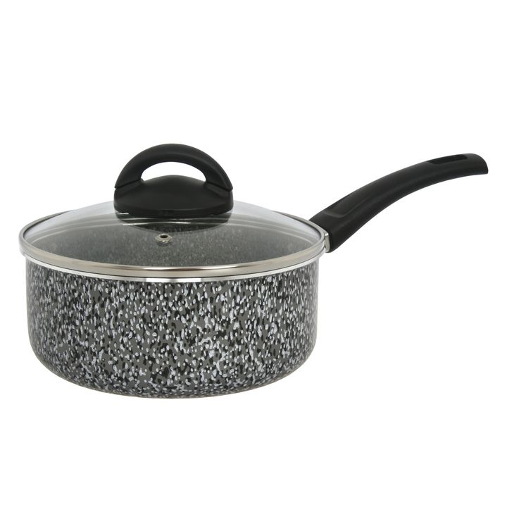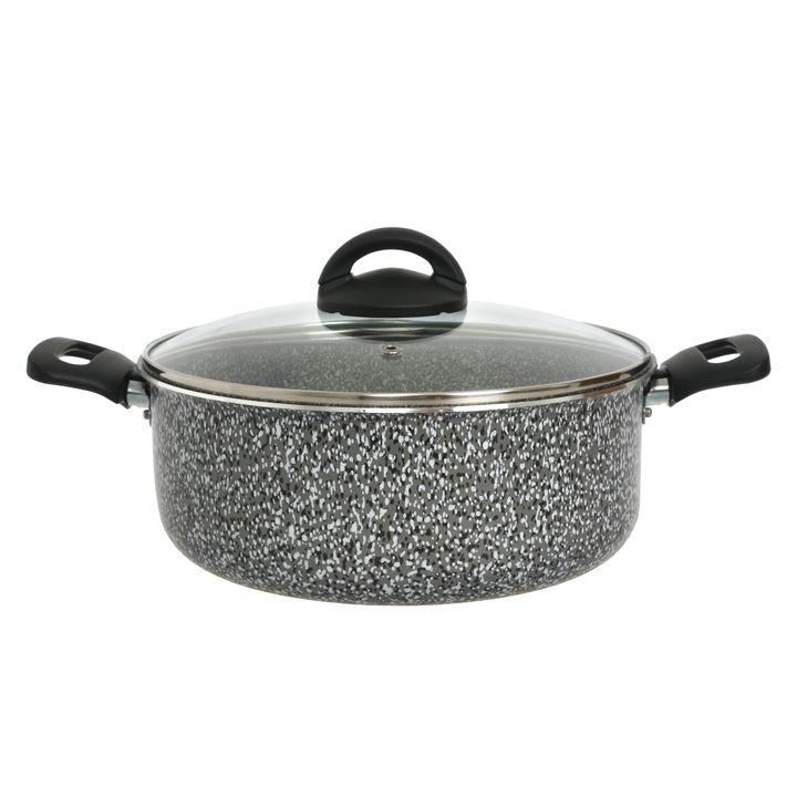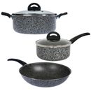 Batería linea Pedra Gris compuesta por : Material : Aluminio con antiadherente de 1,8 mm de espesor con mangos Baquelita negra Cacerola 24cm con tapa de vidrio templado con orificio para salida de vapor, 1,8 mm de espesor. Altura de olla : 9,5 cms / Capacidad : 4,5 lts. Cacerola 18cm con tapa de vid...