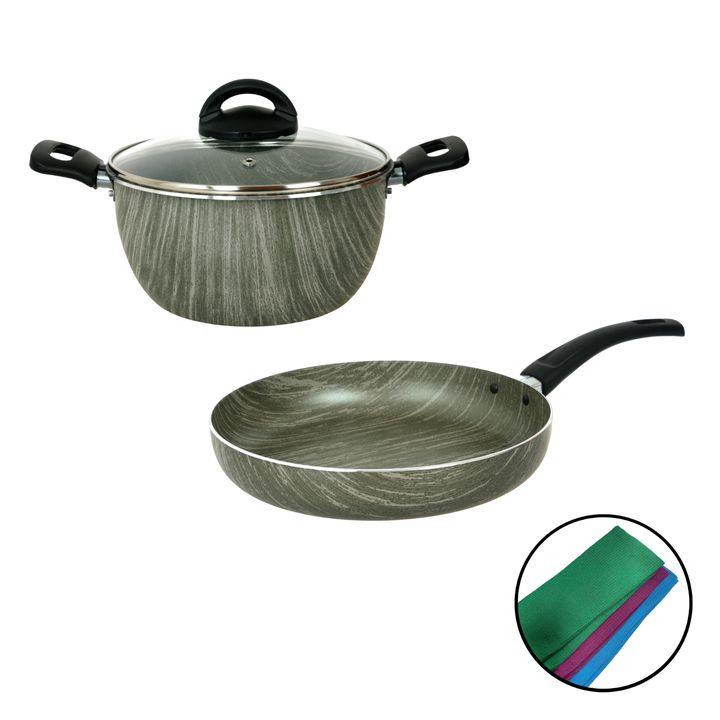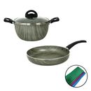 Batería Aston Terra Premium compuesta por : Material : Aluminio con antiadherente de 1,8 mm de espesor con mangos Baquelita negra Cacerola 20 cm con tapa de vidrio templado con orificio para salida de vapor, 1,8 mm de espesor. Altura de olla : 10.5 cms / Capacidad : 2,8 lts. Sartén de 24 cm de diáme...