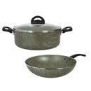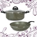 Batería Aston Terra Premium compuesta por : Material : Aluminio con antiadherente de 1,8 mm de espesor con mangos Baquelita negra Cacerola 24cm con tapa de vidrio templado con orificio para salida de vapor, 1,8 mm de espesor. Altura de olla : 9,5 cms / Capacidad : 4,5 lts. Wok de 28 cm antiadherente...