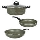 Batería Aston Terra Premium compuesta por : Material : Aluminio con antiadherente de 1,8 mm de espesor con mangos Baquelita negra Cacerola 24cm con tapa de vidrio templado con orificio para salida de vapor, 1,8 mm de espesor. Altura de olla : 9,5 cms / Capacidad : 4,5 lts. Wok de 28 cm antiadherente...