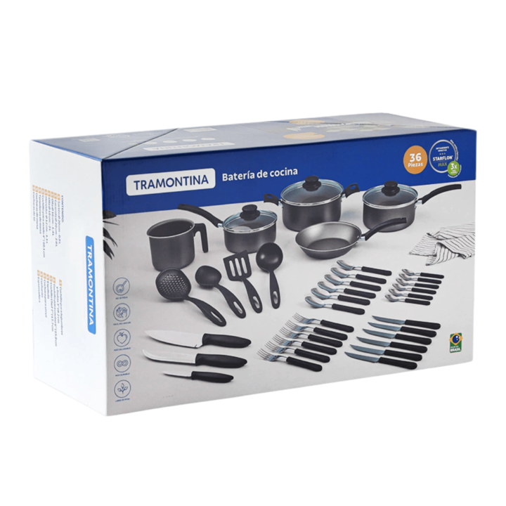 Batería de Cocina Tramontina 36 Piezas 27899/273 Transforma tu experiencia culinaria con la Batería de cocina Tramontina de 36 Piezas. Incluye: 1 Sarten 20 cm / 0.8L 1 Cacerola 20 cm / 2.8L 1 Olla 16 cm / 1.4L 1 Olla 18cm / 2L 1 Hervidor 2cm / 1.1L 6 Cuchillo para asado 4 / 10.1cm 6 Tenedores de mes...