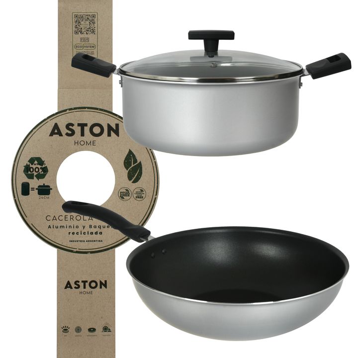 Batería de Coccion Aston Ecologica Reciclada compuesta por : Material : Aluminio Reciclado con antiadherente en su interior de 2 mm de espesor. El mango es fabricado a partir de materias primas naturales y materiales regenerados. Cacerola 24 cm con tapa de vidrio templado con orificio para salida de...