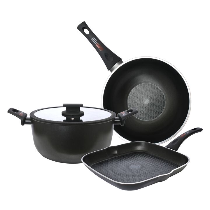 Bateria de cocina de la mas alta calidad , origen Italiana Aluminio puro 99,5%, espesor 3,5 mm / 4mm , forjado para una perfecta difusión del calor y una mejor cocción de los alimentos. PFOA FREE ( Cocina sana ) / NICKEL CADMIUM LEAD FREE ( Revestimiento Salvanatura) / AM SALUS EXTRA STONG ( Revesti...