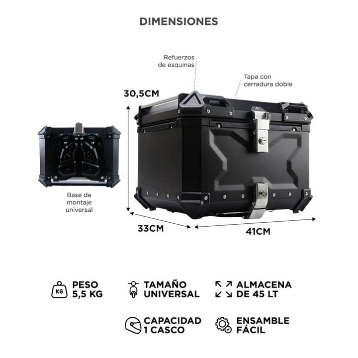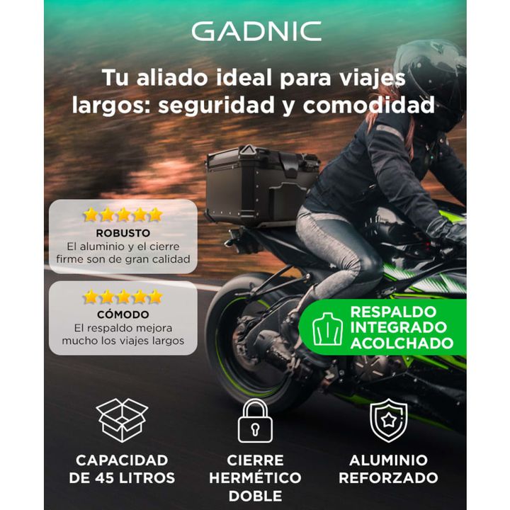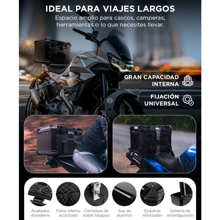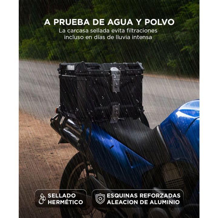 Capacidad ideal para viajes largos: Con 45 litros de espacio útil, transportá todo lo necesario en tus recorridos sin comprometer comodidad ni seguridad. Protección total ante agua y polvo: Su estructura sellada mantiene el contenido seco, incluso bajo lluvia intensa. Ideal para uso diario o rutas e...