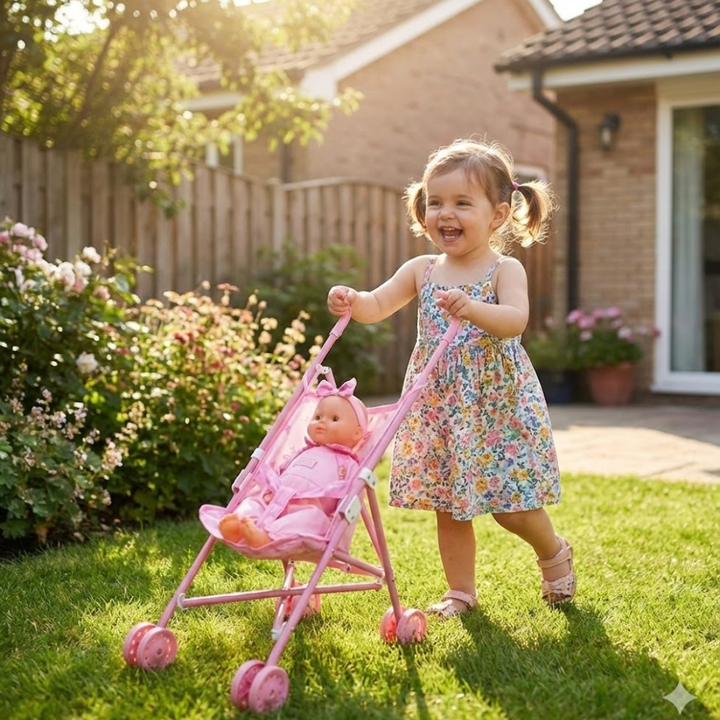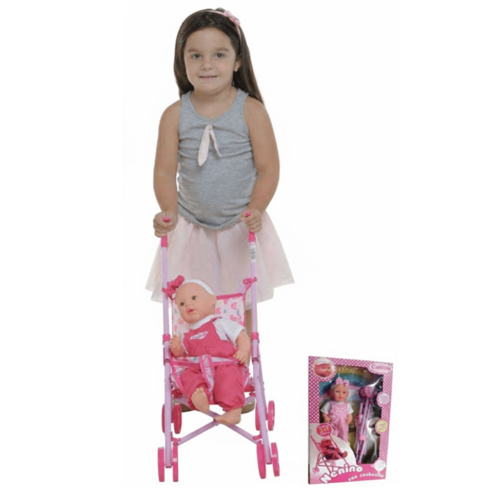 Bebé Cariñito Nenino con cochecito de paseo Bebé con cochecito de paseo. Altura Muñeca 35 cm aprox. Cada presentación tiene un vestuario único e inigualable. Las prendas son surtidas/aleatorias.