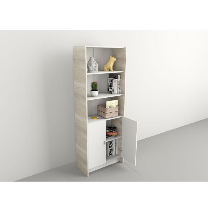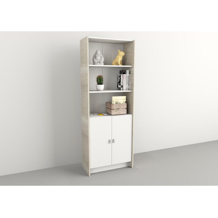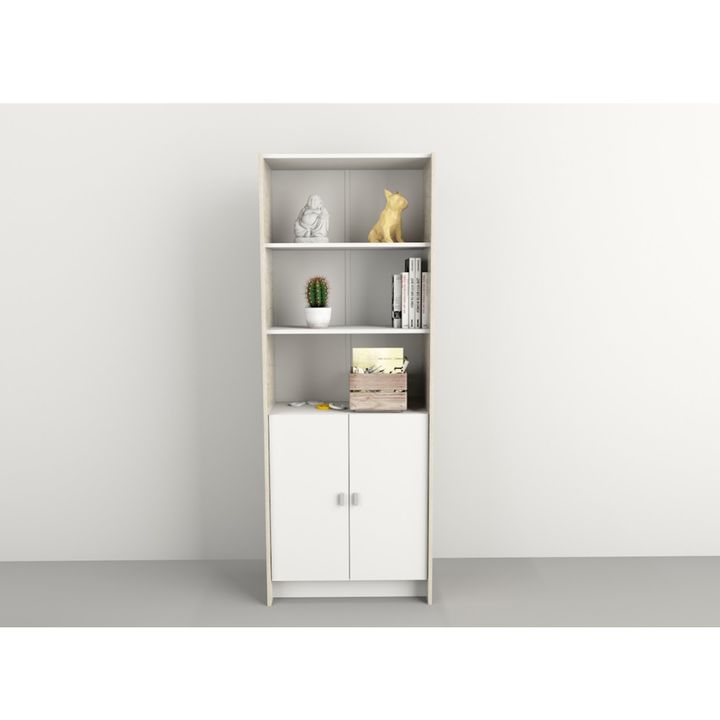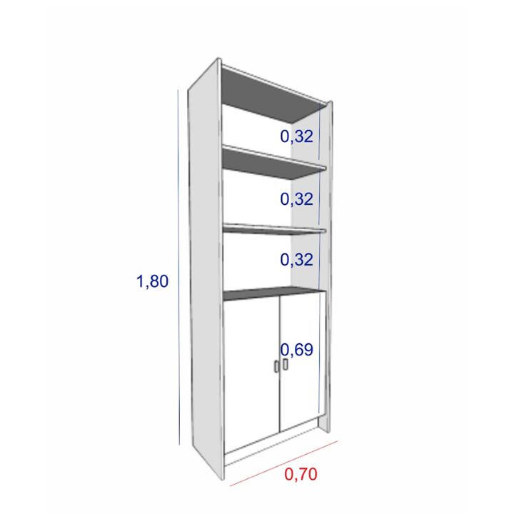 Biblioteca juvenil de melamina de alta resistencia. Dos puertas con bisagras metálicas. Dos estantes exteriores y uno interior. Tiradores metálicos. Sistema Minifix. Color Nevado y Everest. Medidas: Alto: 1.80 mts. Ancho: 0.70 mts. Profundidad: 0.34 mts. Producto seleccionado para venta y entrega “E...