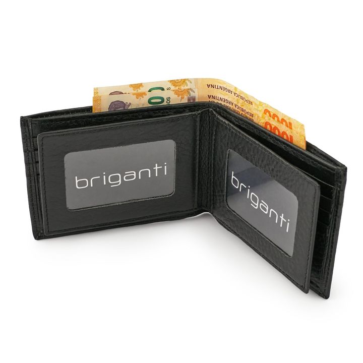 Billeteras Camilo de hombre fabricadas con cuero de primera calidad. Cuentan con dos divisiones, cuatro visores y capacidad para 10 tarjetas. Confeccionadas para quienes buscando algo sencillo pero elegante. - Marca: Briganti - Material Interno: Cuero y Tela - Material Externo: Cuero - Articulo: HMB...