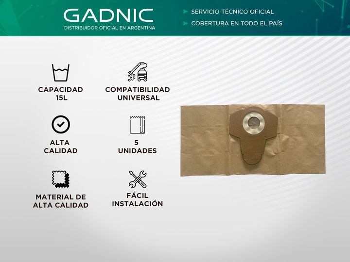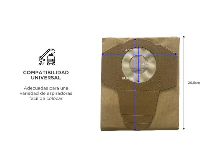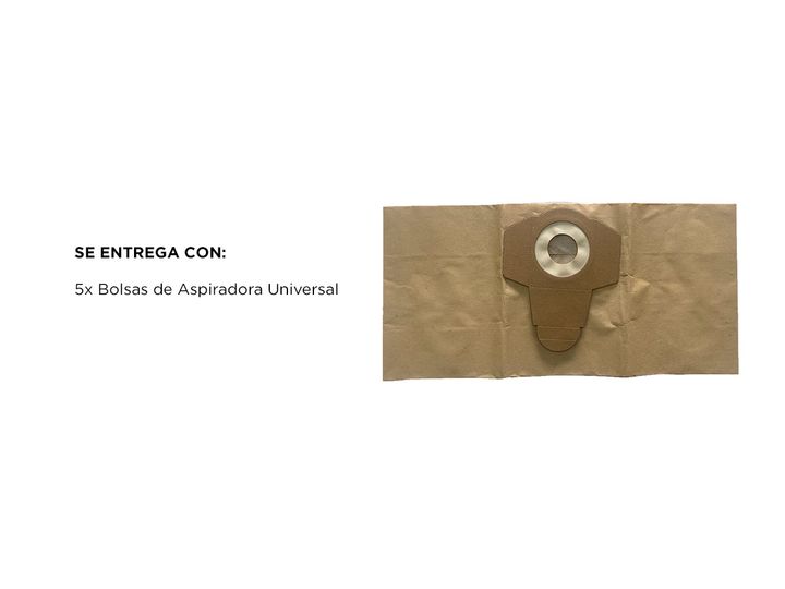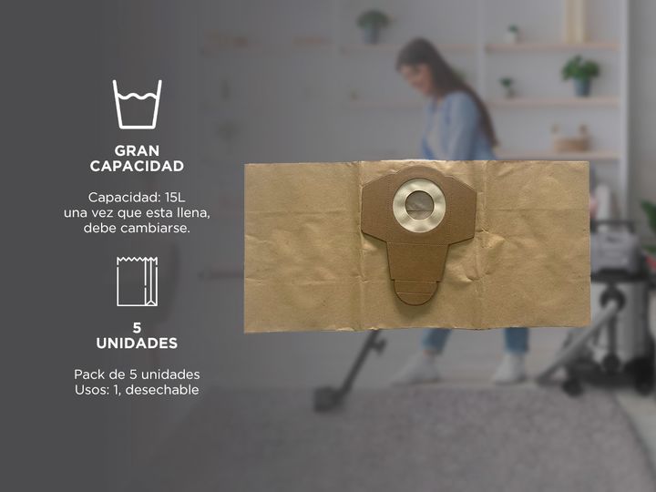 Nuevo set de Bolsas de Aspiradora Las Bolsas de Aspiradora de 15L en este set de 5 piezas son la solución ideal para mantener tu entorno limpio y saludable. Diseñadas para una fácil instalación en tu aspiradora, estas bolsas de papel son la opción perfecta para recoger polvo y suciedad de manera efi...