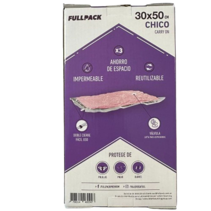 <p><em>Set x 2 Bolsas con valvula de vacio tamaño Chico (Carry On)</em><br /><br /><em>- Medidas: 30 x 50cm</em><br /><em>- Marca: Full pack </em><br /><em>- Origen: China</em><br /><br /><em>- VALVULA DE VACIO NO REQUIERE ASPIRADORA</em><br /><em>- Protege comprime organiza</em><br /...