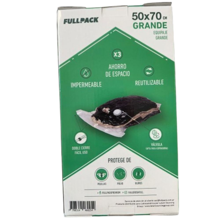 <p><em>Set x 2 Bolsas con valvula de vacio tamaño Grande </em><br /><em>(quipaje Mediano / Grande)</em><br /><br /><em>Medidas: 50 x 70 cm</em><br /><em>Marca: Fullpack</em><br /><em>Origen: China</em><br /><br /><em>- VALVULA DE VACIO NO REQUIERE ASPIRADORA</em><br /><em>- Protege comprime...