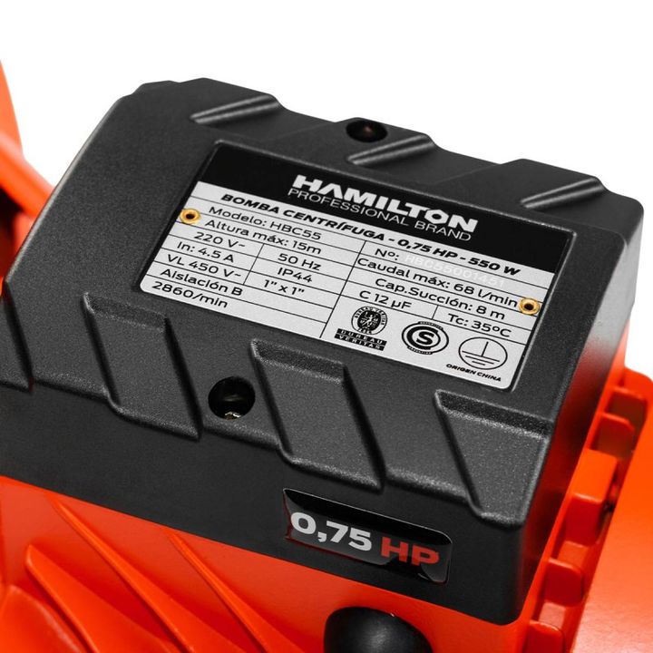 BOMBA CENTR+FUGA HBC55 220V 0,75HP HAMILTON - Potencia: 550 W / 0.75 HP - Alimentación: 220 V - Frecuencia: 50 Hz - Caudal máximo: 68 l/min. - Altura máxima: 15 mts. - Entrada y salida: 1 - Capacidad de succión: 8 mts. - Fase eléctrica: Monofásica - Materiales: Eje de acero inoxidable, Turbina de br...