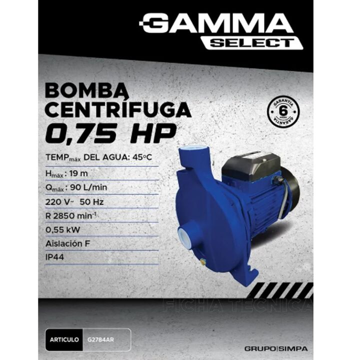 La bomba centrífuga G2784AR modelo BGS-784 está diseñada para brindar alto caudal y excelente rendimiento en instalaciones domésticas, comerciales o pequeñas aplicaciones industriales. Gracias a su motor de 0.75 HP (0.55 kW), con alimentación 220 V~ 50 Hz y 2850 RPM, ofrece un caudal máximo de 90 li...