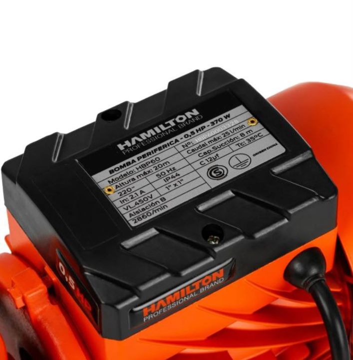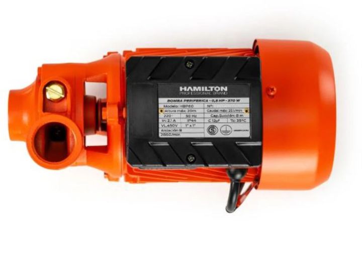 BOMBA PERIFERICA HBP60 370W 1/2HP HAMILTON Bomba Periférica 370w 1/2Hp Turbina de Bronce Hamilton HBP60 Caracteristicas: - Tipo de Bomba: Periférica - Potencia: 0,50 HP - Potencia: 370W - Flujo Máximo: 25 l/m - Elevación Máxima: 20 metros - Alimentación: 220V - Frecuencia: 50 Hz - Entrada y Salida:...