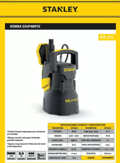 BOMBA SUMERGIBLE STANLEY AGUA LIMPIA 400W 1.3HP 9000L/H SXUP400PCE Bomba Sumergible Stanley Agua Limpia 400w 400pce 9000 L/h es un producto de alta calidad y rendimiento. Ideal para aquellos que necesitan una solución eficiente para el manejo de agua limpia. Con una potencia de 400w y una capacidad ...