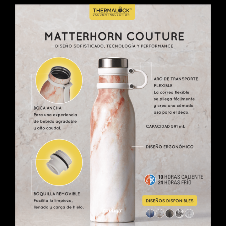 Botella TÉRMICA Contigo Matterhorn Couture 591ml Rose Quartz Contigo Matterhorn está preparado para ayudarlo a manejar el calor o el frío. Ya sea en un automóvil caliente o en una cocina concurrida, Matterhorn mantendrá sus bebidas frías hasta por 18 horas. (Sí, lo leiste bien). Esta botella de agua...