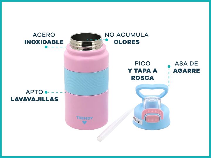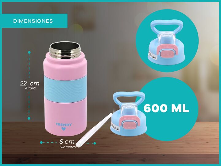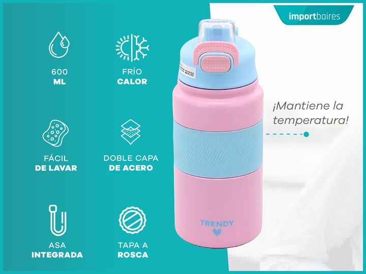 BOTELLA TRENDY TERMO DEPORTIVA APERTURA AUTOMATICA · Posee una Capacidad de 600 ml · Apertura automática por botón · Incluye bombilla para usar como sorbete · Pico vertedor o cebador de polipropileno: · Cuerpo antideslizante · A prueba de fugas · Acero inoxidable · Interior de acero inoxidable 304 d...