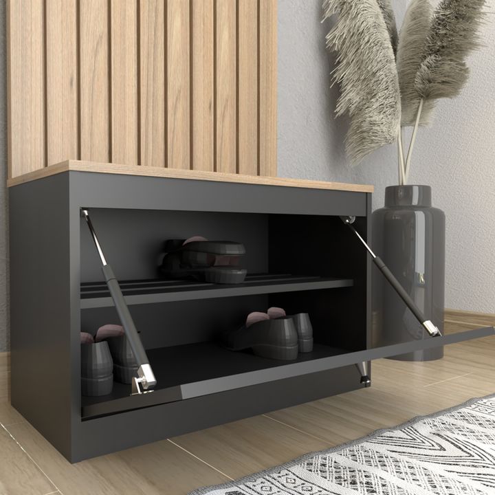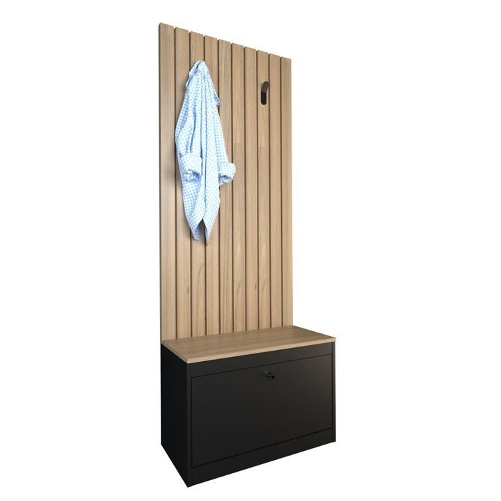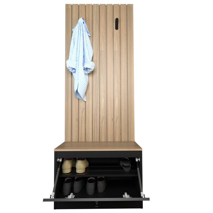 Botinero Recibidor de melamina de alta resistencia. Ideal para departamentos, casas o espacios pequeños donde cada rincón cuenta. Combinaciones modernas. Puerta con bisagra metálica y doble pistón neumático. Cuenta con capacidad para guardar 6 pares de zapatos. Percheros metálicos. Sistema Minifix. ...