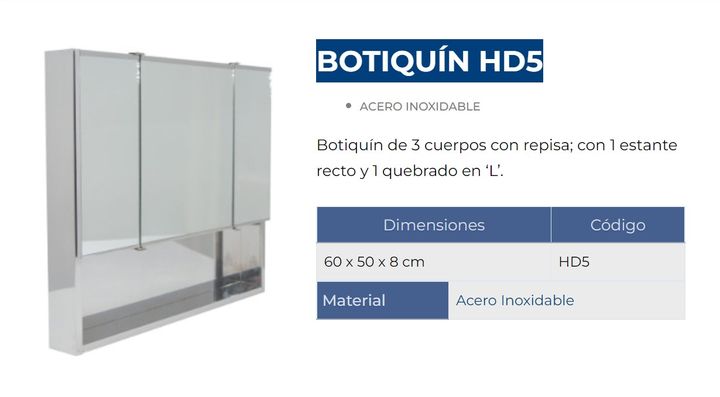 DHINOX BOTIQUIN ACERO INOX. 60x50x8 HD5 MODELO: DHINOX-21 CARACTERISTICAS: Botiquín de 3 cuerpos, 1 con repisa; con 1 estante recto y 1 quebrado en U. Cód: HD5 Fabricado en acero inoxidable. Es un mueble funcional, ya que permite tener siempre a mano y protegidos productos de uso habitual, además de...