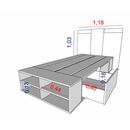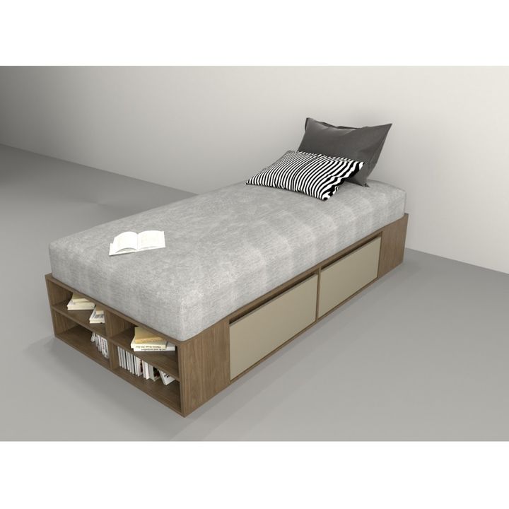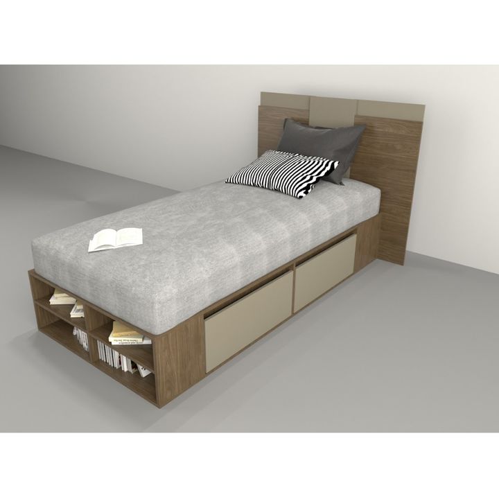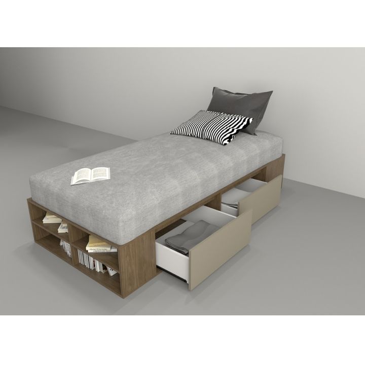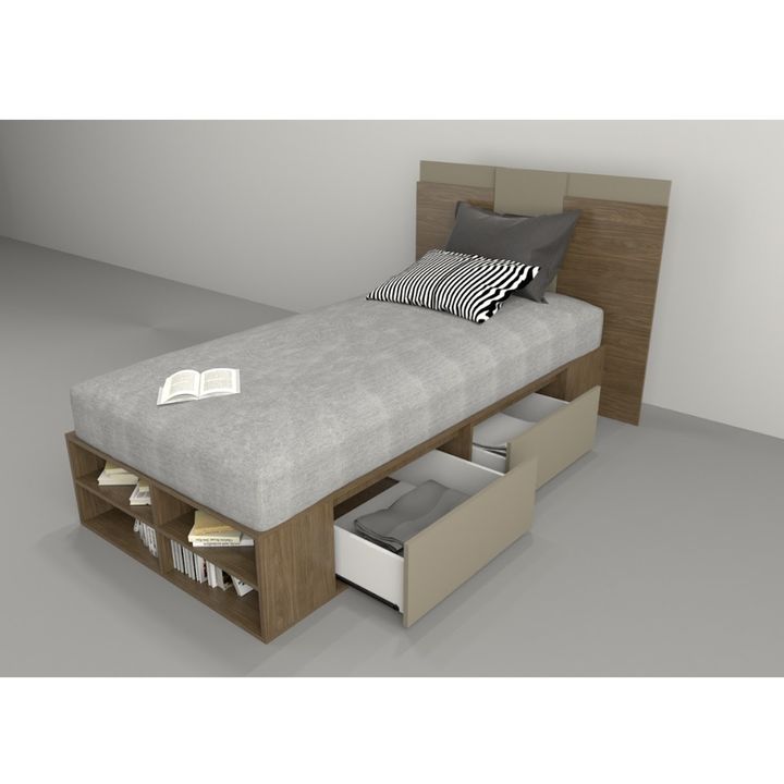 Box multifunción Juvenil estilo minimalista. Para colchones de hasta 0.90 mts de ancho. Melamina de 15 mm. Dos cajones por lado con correderas metálicas. Dos estantes zapateros frontales. Respiración para colchón. Tirador plástico estilo Botón. Base plástica. Sistema Minifix. Color Nogal y Gris. Med...