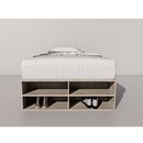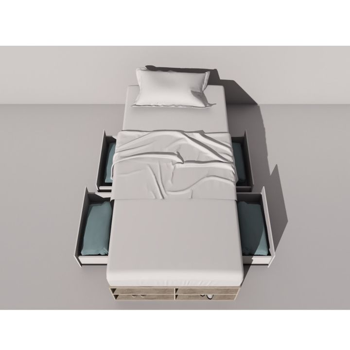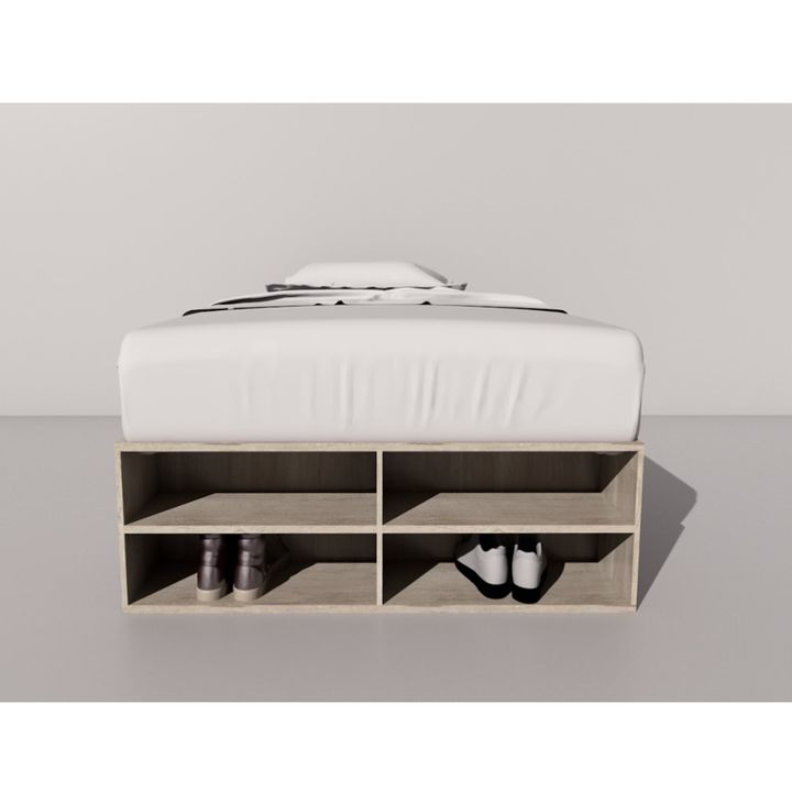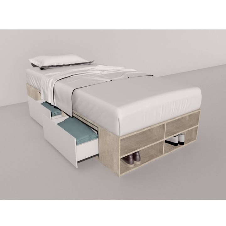 Box multifunción Juvenil estilo minimalista. Para colchones de hasta 0.90 mts de ancho. Melamina de 15 mm. Dos cajones por lado con correderas metálicas. Dos estantes zapateros frontales. Respiración para colchón. Tirador plástico estilo Botón. Base plástica. Sistema Minifix. Color Nevado y Everest....