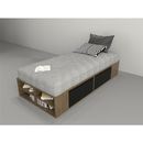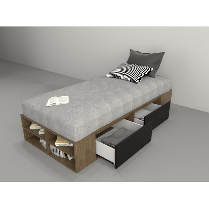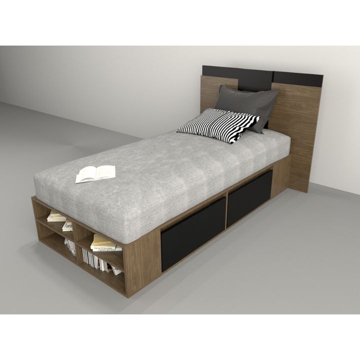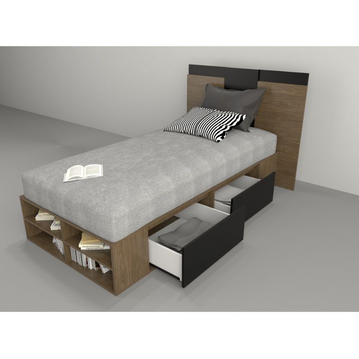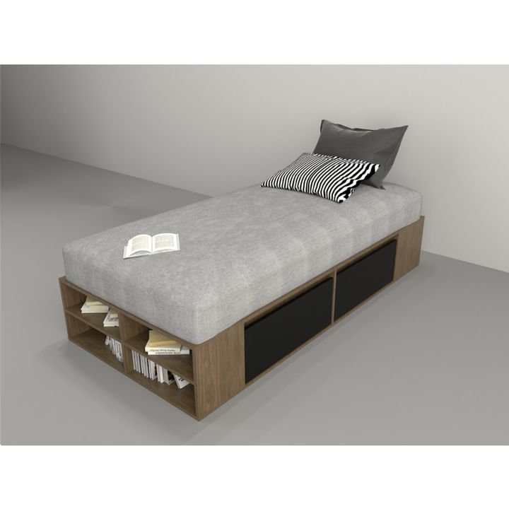 Box multifunción Juvenil estilo minimalista. Para colchones de hasta 0.90 mts de ancho. Melamina de 15 mm. Dos cajones por lado con correderas metálicas. Dos estantes zapateros frontales. Respiración para colchón. Tirador plástico estilo Botón. Base plástica. Sistema Minifix. Color Nogal y Negro. Me...