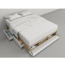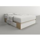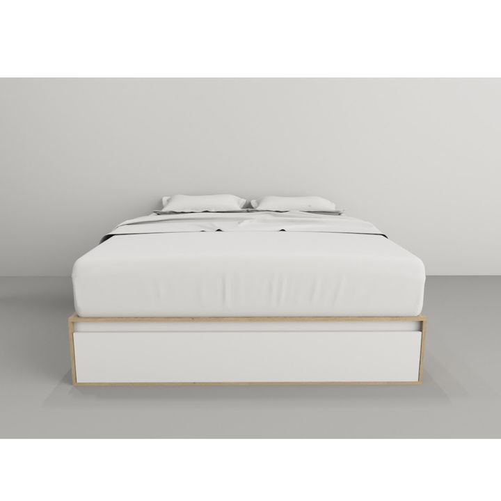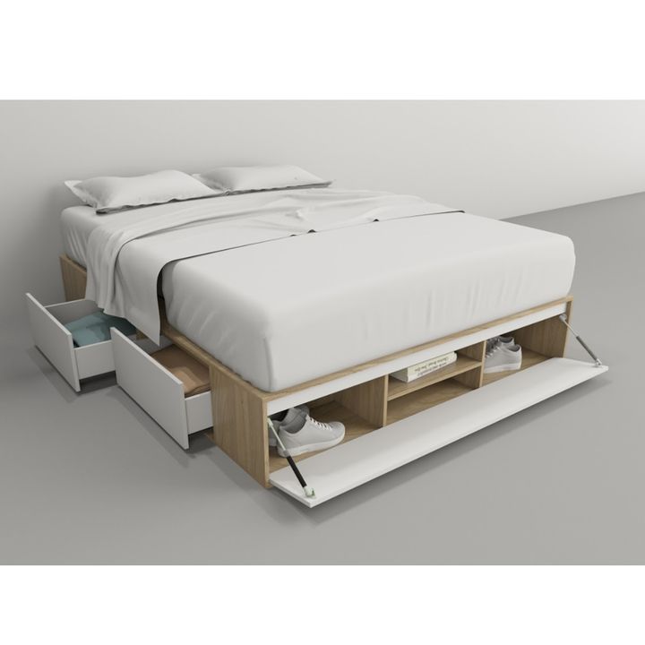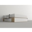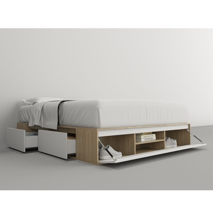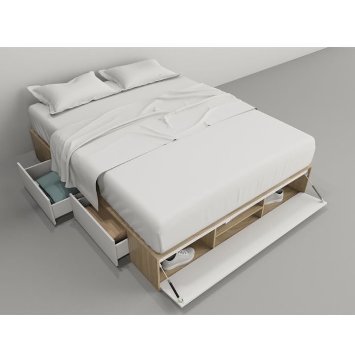 Box multifunción estilo minimalista. Para colchones de hasta 1.60 mts de ancho x 2.00 mts de largo. Melamina de 15 mm. Dos cajones por lado con interiores revestidos y con correderas metálicas. Puerta en piecera con doble pistón neumático y estante central. Respiración para colchón. Sistema Minifix....