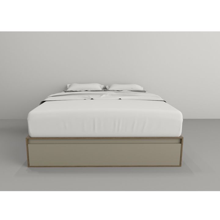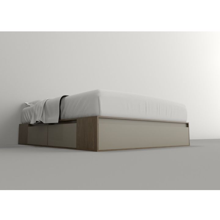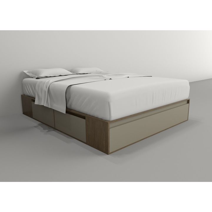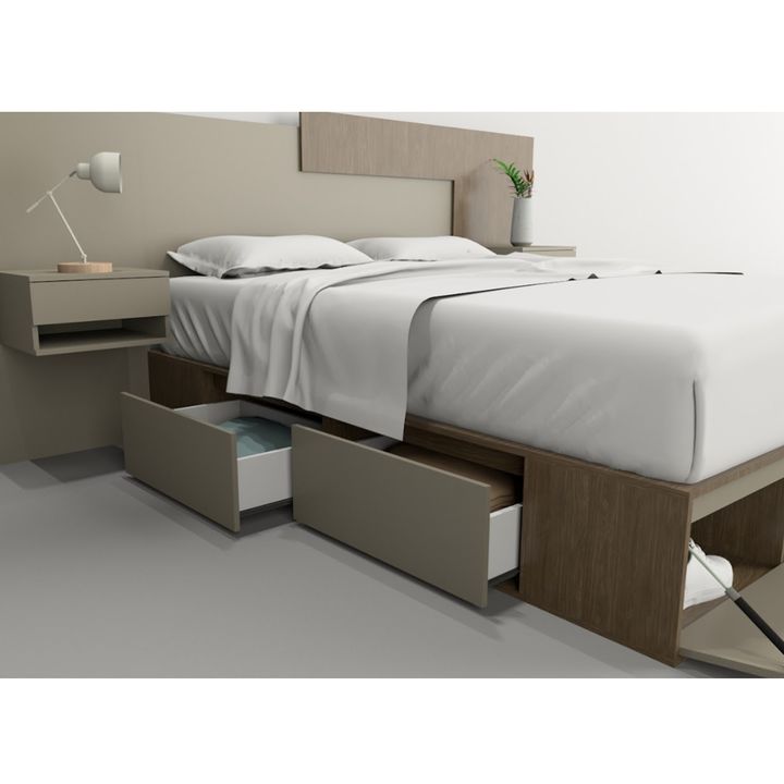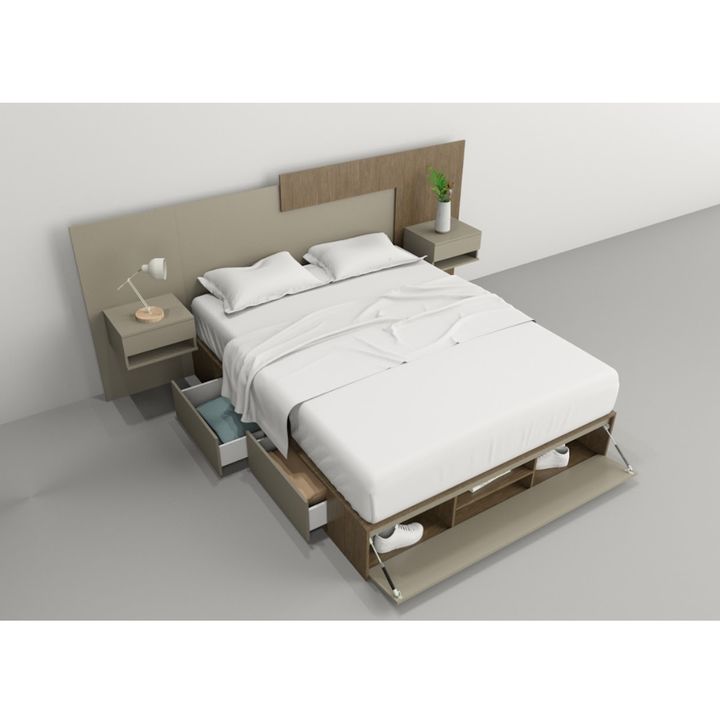 Box multifunción estilo minimalista. Para colchones de hasta 1.60 mts de ancho x 2.00 mts de largo. Melamina de 15 mm. Dos cajones por lado con interiores revestidos y con correderas metálicas. Puerta en piecera con doble pistón neumático y estante central. Respiración para colchón. Sistema Minifix....