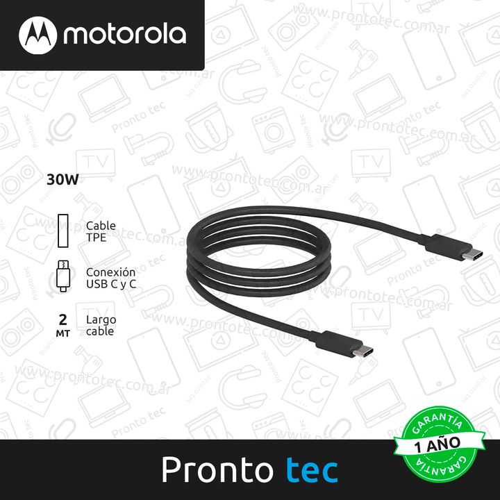 Con el cable de carga rápida de 2 metros de Motorola vas a poder sincronizar tus datos, fotos y música a una velocidad de hasta 480 Mbps. Compatible con dispositivos USB C y Puerto USB C, y una potencia máxima de 30 W. CARACTERÍSTICAS: - Marca: Motorola - Modelo: SJC00CCB20ET1NS - Potencia: 30 W - V...