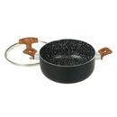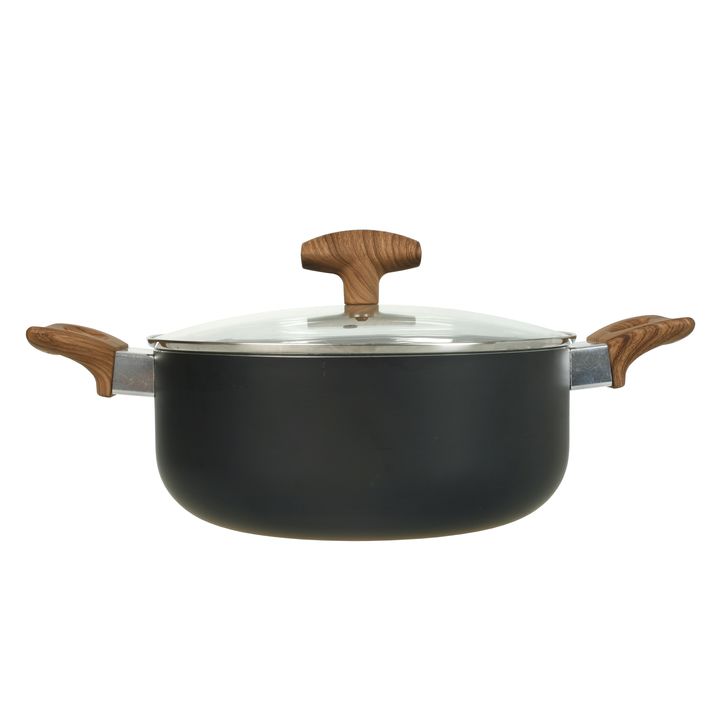 Cacerola Olla de 24 cms recubierta internamente con ceramico antiadherente. Material : Aluminio con antiadherente en su interior. El mango es de baquelita simil madera y la tapa de vidrio templada con orificio salida de vapor. El interior tiene antiadherente ceramico ( pintitas blancas) , el exterio...