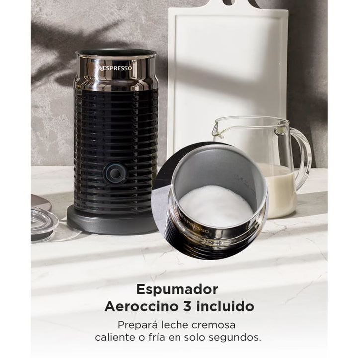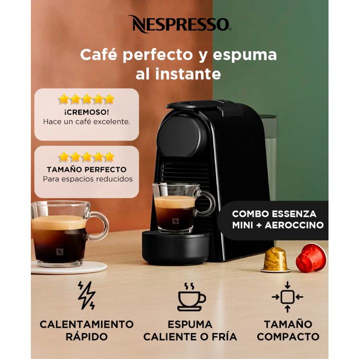 Cafe profesional y espuma perfecta en casa La Nespresso Essenza Mini Black D30 con Aeroccino es la combinacion ideal para disfrutar cafe de alta calidad y bebidas con leche en un formato compacto. Con su bomba de 19 bares y calentamiento en solo 25 segundos logra espressos y lungos con crema densa y...