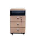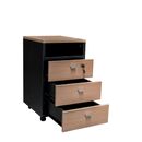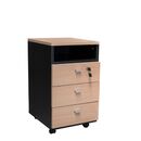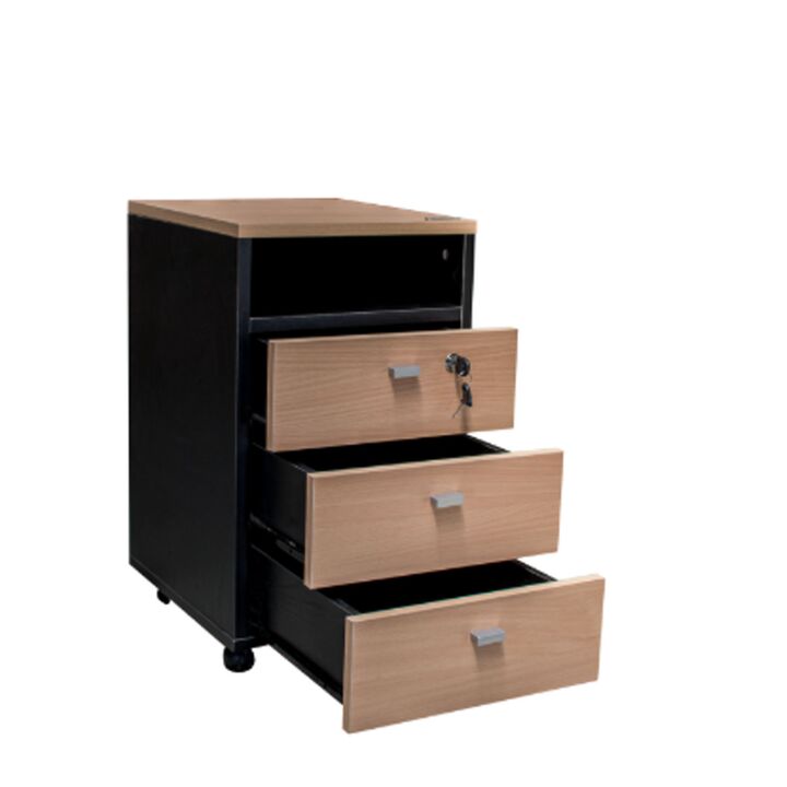 Cajonera Profesional de melamina. Complemento de la Línea Profesional. Tres cajones con correderas telescópicas, uno de ellos con cerradura. Un estante superior. Cuatro ruedas que permiten su traslado. Color Negro y Haya Medidas: Ancho: 0.37 mts. Alto: 0.64 mts. Profundidad: 0.43 mts.
