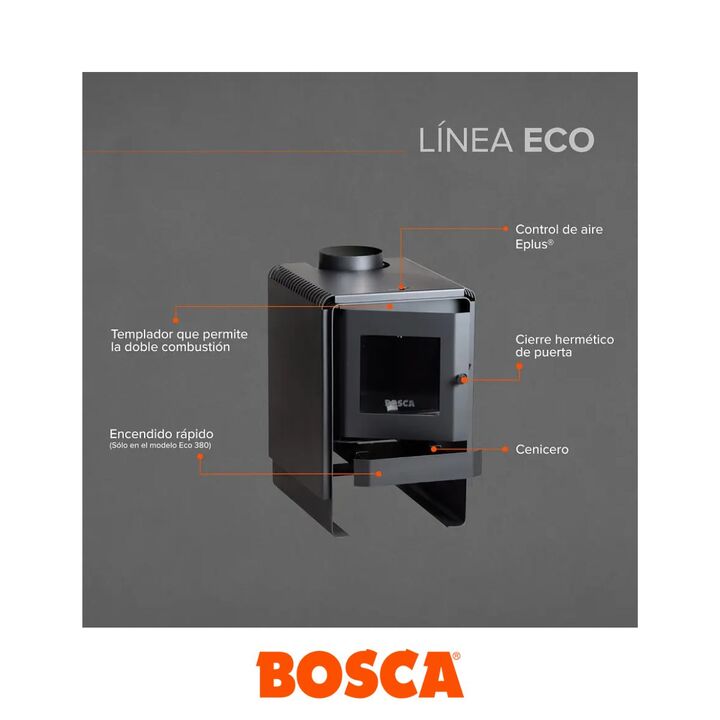 CALEFACTOR A LEÑA BOSCA ECO 360 150 MT2 SALAMANDRA Marca:Bosca Código: 57060102 Simpleza y funcionalidad La Eco 360 es un modelo ideal para entregar calidez y bienestar a casas de un piso de 150 m2 aproximadamente. Está hecha completamente de acero, pesa 59,6 kg y cuenta con recubrimiento de placas ...