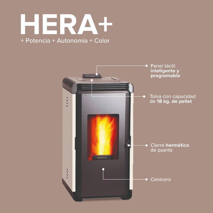 CALEFACTOR A PELLET BOSCA HERA + MARFIL 9KW Marca:Bosca Código: 57060609 Estufa a pellet Bosca Hera+ Marfil + Potencia + Autonomía + Calidez El pellet constituye una fuente de energía mucho más económica, totalmente renovable y fabricada con residuos fósiles. La Hera+ cuenta con un sistema de progra...