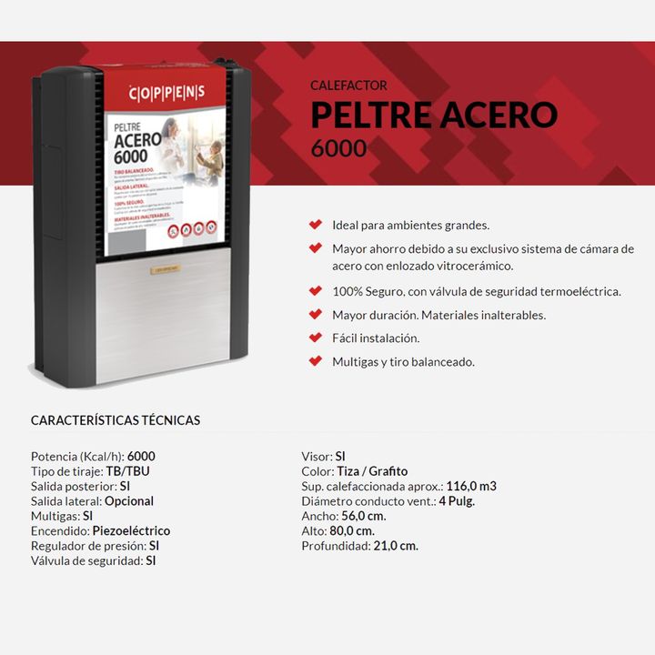 Calefactor Coppens 6000 TB Salida Derecha Peltre Acero Multigas Modelo: C60BDPAM Características: • Ideal para ambientes grandes. • Mayor ahorro debido a su exclusivo sistema de cámara de acero con enlozado vitrocerámico. • 100% Seguro, con válvula de seguridad termoeléctrica. • Mayor duración. Mate...