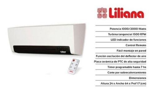 - Potencia: 1000 / 2000 Watts - Potente turbina tangencial de 1500 RPM - LED indicador de funciones - Control remoto - Fácil montaje en pared - Función oscilación del deflector de aire - Placa cerámica de PTC de alta seguridad - Timer programable de ½ hasta 7 ½ hs - Corte por sobrecalentamiento - Me...