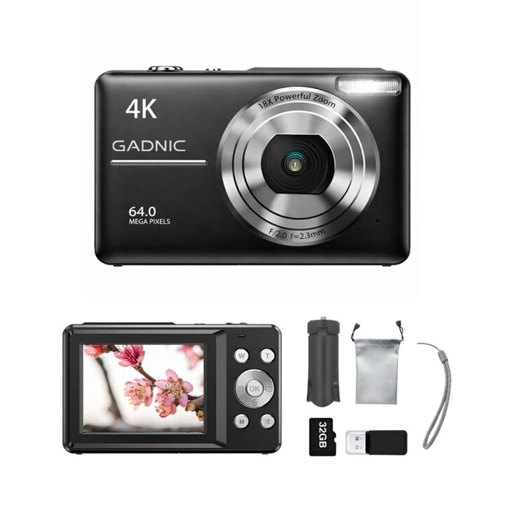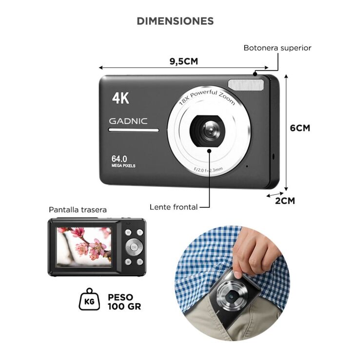 Calidad de imagen y video para capturar cada momento: La cámara digital Gadnic permite sacar fotos de alta resolución de hasta 64 MP y grabar videos en calidad 4K, logrando imágenes claras y definidas para uso diario, viajes o tareas escolares. Su sensor CMOS ayuda a obtener mejores resultados en di...