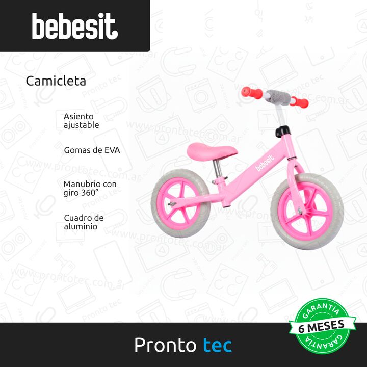 La camicleta Bebesit es el primer paso ideal para que los niños aprendan a andar en bicicleta de forma segura y divertida. Su estructura liviana y resistente favorece el equilibrio y la coordinación, preparando a los pequeños para pedalear sin ruedas de apoyo. Cuenta con ruedas de EVA antideslizante...