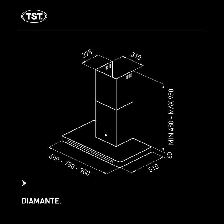 Motor interno 6 de bajo nivel sonoro . Comando touch con timer programable . Iluminacion tecnologa led . Acabado acero vidrio negro templado . Cubre cano extensible . Filtro metlico lavable . Especificaciones tecnicas . Extraccion 800 m3h con salida libre . Velocidades 3 . Ancho 900 mm . Opcional . ...